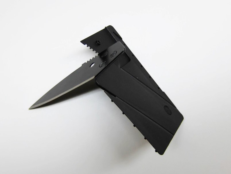 Składany na płasko nóż w kształcie karty kredytowej. Zbliżone do karty wymiary pozwalają na umieszczenie noża w portfelu.